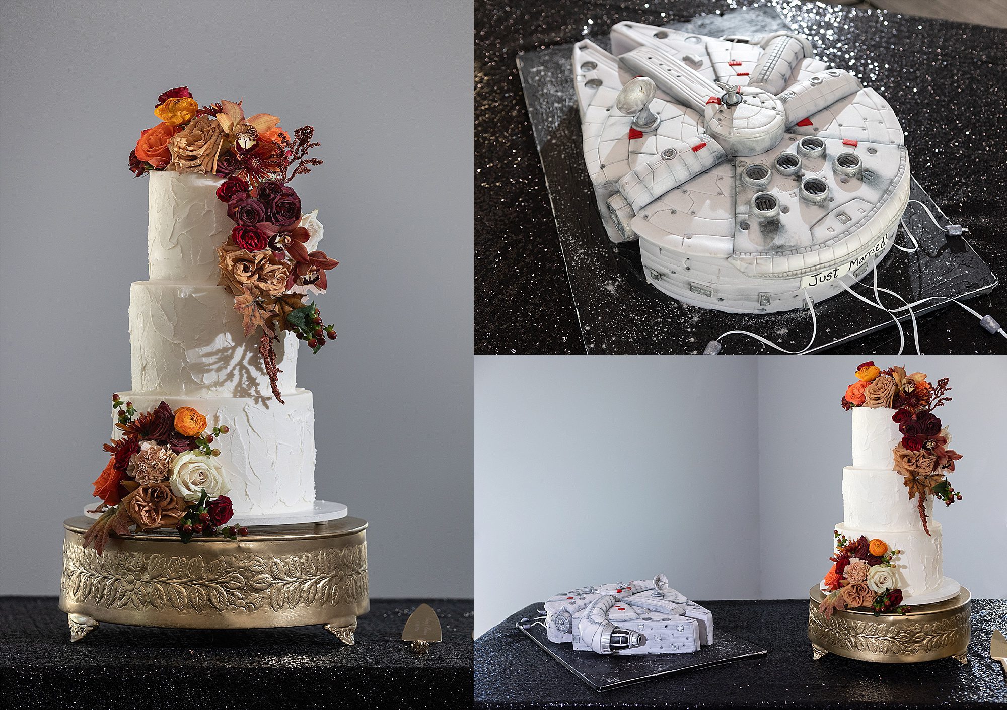 I’d met Chrissy and Harrison earlier in the year for their engagement session. I always recommend engagement portraits so that on your wedding day, bridal portraits happen very quickly. You already know what to expect! Chrissy’s bridesmaids wore a gorgeous array of fall colors. Looking for wedding fashion inspiration? Look no further! These ladies were beautiful. It was such a sweet, emotional day, full of laughter and happy tears. I loved Harrison’s groom’s cake. He’s a big Star Wars fan, and the baker created a perfect replica of the Millenium Falcon. Amazing. Congratulations, Chrissy and Harrison!